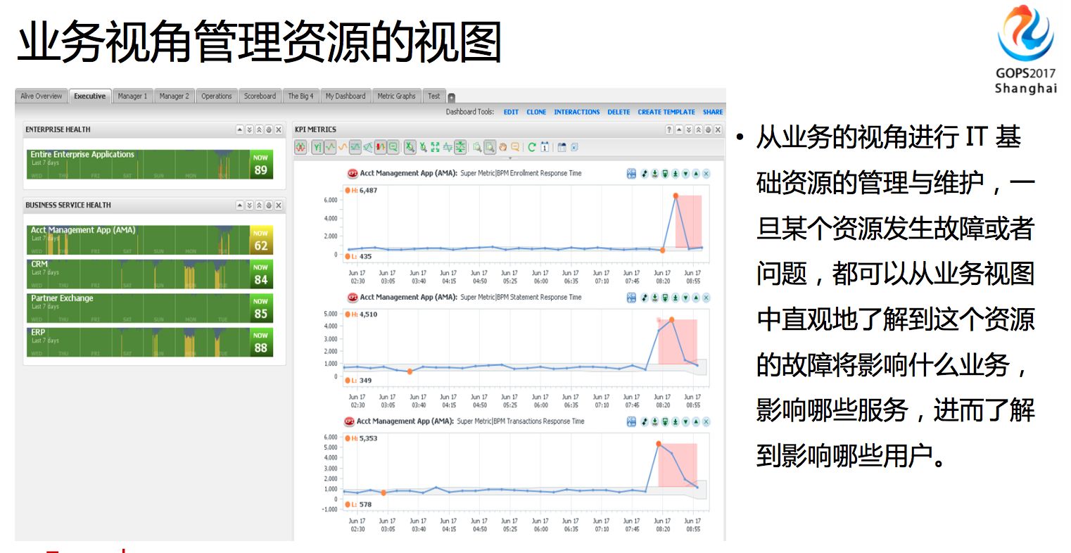 從(cóng)業(yè)務的(de)視(shì)角進行(xíng)IT基礎資源的(de)管理(lǐ)與維護,一(yī)旦某個(gè)資源發生(shēng)故障或問✘(wèn)題,都(dōu)可(kě)以從(cóng)業(yè)務視(shì)圖中直觀地(dì)了(le)解•到(dào)這(zhè)個(gè)資源的(de)故障将影(yǐng)響什(shén)麽業(yè)務影(↕yǐng)響哪些(xiē)服務,進而了(le)解到(dào)影(yǐng)響哪些(xiē)用(yòng)戶。