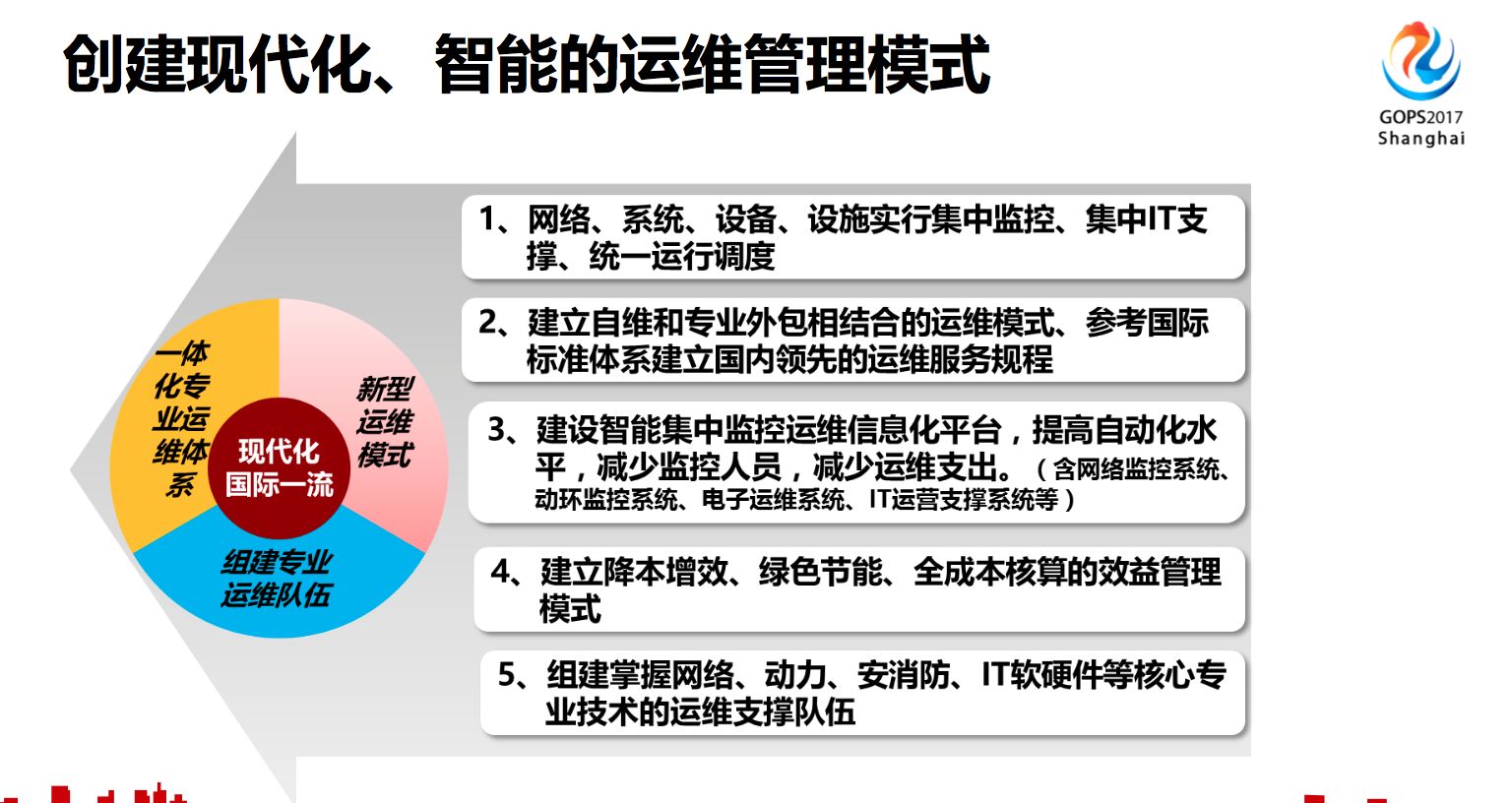 我們希望構建現(xiàn)代化(huà)和(hé)智能(néng)的(de)運維管理(lǐ)模式,主要(yào)是(shì)以下(xià)5個(gè)方面,如(rú)下(xi à)圖: