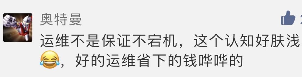 但(dàn)是(shì),運維人(rén)員(yuán)的(de)內(nèi)部崗位流向,和(hé)運維行(xíng)業(yè)是(shì)否消失,一(yī)λ毛錢(qián)關系都(dōu)沒有(yǒu)。運維需要(yào)有(yǒu)危機(jī)感,但(dàn)不(bù)需要(yào)被恐懼。