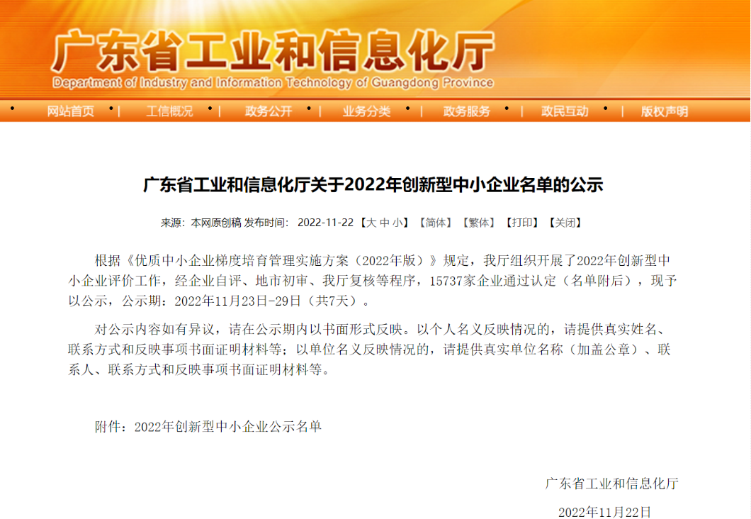 近(jìn)日(rì),廣東(dōng)省工(gōng)業(yè)和(hé)信息化(huà)廳公示了(le)2022年(nián)創新型中小(xiǎo)企業(yè')名單,廣州市瞬騰軟件科技有限公司通(tōng)過地(dì)市(shì)初審、工(gōng)信廳複核等層層篩選,正式被認定并入選廣東(dōn✔g)省2022年(nián)創新型中小(xiǎo)企業(yè)。